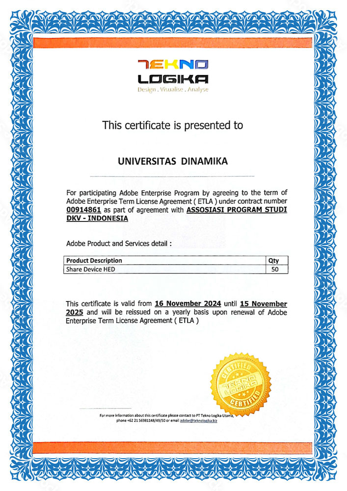 Program Studi S1 Desain Komunikasi Visual (DKV) Universitas Dinamika dengan bangga mengumumkan partisipasinya dalam Adobe Consortium Enterprise Terms License Agreement (ETLA) for Asprodi DKV. Melalui konsorsium ini, Prodi DKV Universitas Dinamika kini memiliki akses resmi dan berlisensi institusi terhadap seluruh rangkaian aplikasi Adobe Creative Cloud, termasuk Adobe Photoshop, Illustrator, InDesign, Premiere Pro, After Effects, dan lainnya.